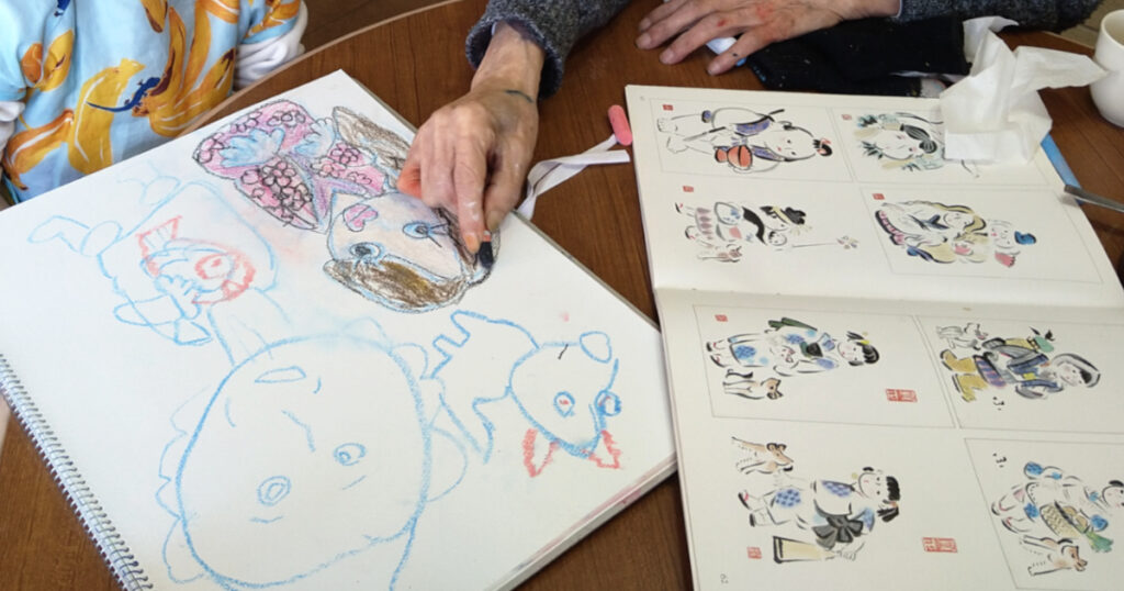 おじいちゃん先生も、横から手を出して犬を描いてみたり。